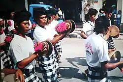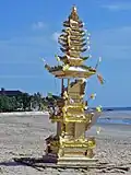 At the cremation ground, the corpse is placed into the bull-shaped lembu or temple-shaped wadah, final hymns are recited and the cremation pyre lit.[2] While the corpse burns, the Balinese music team plays the beleganjur music, a battle song symbolizing the soul's fight with evil underworld to reach the worry-free upper realm.[1][10] Twelve days after the cremation, the families collect the ashes, fill it inside coconut shell, carry it to nearby ocean or sea to return the remains back to the elements.[1]