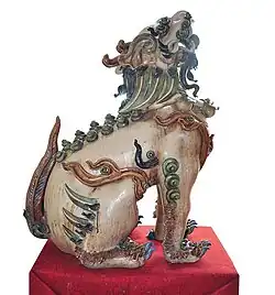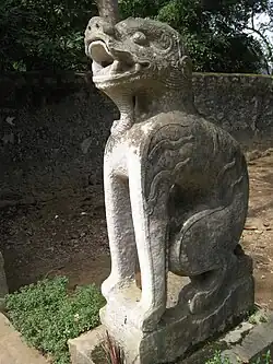 Nghê (chữ Hán: 猊) is a mythical animal in Vietnamese culture, a combination of kỳ lân (or lion) and dog, often used as a mascot in front of communal temples, temples, pagodas, shrines in Vietnam. In the countryside of North Vietnam, in front of the village gate there is always a big stone Nghê to protect the whole village, in front of the communal temple gate there is a stone Nghê, and in front of each house there is usually a small stone dog sitting in front of the guard. To keep it for the homeowner, in the southern countryside in front of the house, the guide often places a statue of a dog ceramic.