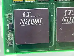 The Ni1000 is an artificial neural network chip developed by Nestor Corporation and Intel, developed in the 1990s. It is Intel's second-generation neural network chip, but the first all-digital chip. The chip is aimed at image analysis applications– containing more than 3 million transistors – and can analyze 40,000 patterns per second.[1] Prototypes running Nestor's OCR software in 1994 were capable of recognizing around 100 handwritten characters per second. The development was funded with money from DARPA and Office of Naval Research.[2]