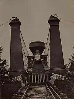 - ^ Sir Samuel Brown's Stockton Railway Bridge in the United Kingdom was the first suspension bridge designed to carry railway traffic, but it could not support the weight of a locomotive. Hence, it was non-operational as a railway bridge. Built in 1829, the bridge was closed in 1830.[47]