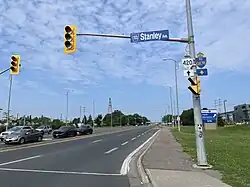 East of the QEW, Highway encounters an interchange with Dorchester Road as both cross the Queenston-Chippawa Power Canal.[7] This interchange was originally a traffic circle that was removed in the early 1970s.[8] The numerous lanes from the QEW interchange to the west begin to converge between residential subdivisions east of Dorchester Road, gradually narrowing to four through lanes at the Drummond Road interchange.[7] After passing beneath Portage Road, the route widens on approach to an at-grade intersection with Stanley Avenue. This intersection is the eastern end of both the freeway segment of the route and the signed King's Highway 420; east of Stanley Avenue the route is signed as Niagara Regional Road 420 and known as Falls Avenue.[9][10]