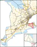 It consists of the towns of Grimsby, Lincoln and Pelham, the Townships of West Lincoln and Wainfleet, and part of the City of St. Catharines lying westerly of a line described as follows: commencing at the intersection of the northerly limit of said city with the production of Courtleigh Road; thence southerly along said production, Courtleigh Road, and Third Street Louth to Queen Elizabeth Way; thence easterly along Queen Elizabeth Way to Highway No. 406; thence generally southerly along said highway to First Street Louth; thence southerly along said street to the southerly limit of said city.[4]