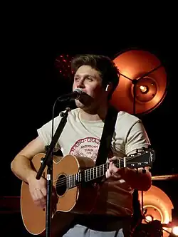 Greg received a guitar for his 15th birthday which he only used once and then it "sat around for a while" until Horan himself picked it up.[11] Horan, then aged 11, taught himself how to play by following YouTube tutorials. His aunt discovered his singing ability one day when she was in the car with Horan as he started singing, and she had initially thought that the radio was on.[12] As a teenager, he performed at the Mullingar Arts Centre during a fundraiser for the local football team, the Shamrocks. He also bagged a support slot with former X Factor contestant Lloyd Daniels at the Academy club in Dublin.[13]