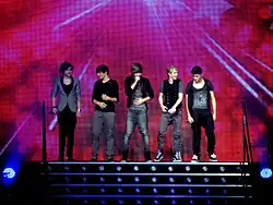 In September 2012, the group released "Live While We're Young", the lead single from their upcoming second album, which peaked at number three in the UK and US.[23][24] The album's second single, "Little Things," spawned the band's second number one single in the UK.[25] In November 2012, Take Me Home, One Direction's second album, was released. It reached number one in over 35 countries,[26][27][28][29] and, after reaching number one on the Billboard 200, the group became the first boy band in US chart history to record two number-one albums in the same calendar year alongside becoming the first group since 2008 to record two number-one albums in the same year.[30] To support the album, they embarked on their second headlining tour, the Take Me Home Tour, playing over 120 shows over four continents. In August 2013, One Direction: This Is Us, a 3-D documentary concert film was released and was a box office success, grossing over $68.5 million.[31][32][33]