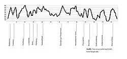 The first section of the Nibelungensteig is divided into three legs that are between 12 and 15 kilometers long. The first leads from Zwingenberg (Bergstraße) over the Melibokus hill and the Felsberg hill. At the base of the Felsberg lies the Felsenmeer (“rock chaos” or “sea of rocks”)[6] to Reichenbach.[7] The second leg passes by the Hohenstein, a quartzite rock popular with rock climbers, and Lindenfels. From there the third leg leads to one of the so-called Siegfried's spring (Siegfriedbrunnen), near Grasellenbach. Out of all the Siegfried's springs in the Odenwald, at which Siegfried was supposedly assassinated by Hagen, the one near Grasellenbach is the best known. Another of the springs is the Zittenfeldener Quelle (spring of Zittenfeld).[8]