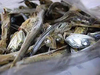 Niboshi (煮干し), often called iriko (炒り子) in Western Japan, are small dried fish used in Japanese cuisine for making dashi (soup stock). They can also be eaten as snacks, or as a side dish. The types of fish used include anchovies, sardines, round herring, Pacific sand lance and others.[1] Niboshi made of anchovies are the most common.[2]