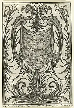 In 1623 a book was published in London under the title De Grotesco. Per utilis atq omnibus quibus pertinebit valde necessari Liber per Nicasius Rousseel ornatissimo, generosissimo atq variarum artium peritissimo viro Domino G Heriot. It contained prints engraved by Johan Barra (or Bara, or Jan Barra) after designs by Roussel and was dedicated to the Scottish goldsmith to the court and philanthropist George Heriot.[10] Each page consists of a frame filled with grotesques composed of human masks and animal and bird monsters attached to plant forms.[11] In 1644 a Dutch language version of 12 of the plates was published in Amsterdam by Claes Jansz. Visscher under the title Seer aerdige / GROTISSEN / dienstich / alle die de Teyckenkonst hanteren / getekent door / Nicasius Rouseel / gedruckt bÿ / CJVisscher. A.o / 1644. This set was subsequently re-issued probably by Nicolaes Visscher II around 1680 and by Joannes de Ram in 1684.[12]