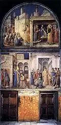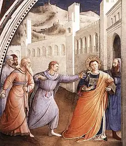 The scenes of St. Stephen follow the Biblical account in the Acts of the Apostles, while those of St. Laurence are patterned after the older cycles in the basilica of San Lorenzo fuori le Mura, where he is buried. Stephen was a Greek-speaking Jew, one of the first deacons named in Jerusalem by St. Peter – Ordination of St Stephen with St Stephen distributing Alms (lunette). His prayers (The Prayer of St. Stephen) earned him the hostility of his opponents in the city, who eventually stoned him to death in front of the city gate.