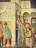 Laurence was a deacon (Ordination of St Laurence) to whom Pope Sixtus II had entrusted the Church's treasure in order to give it to the Roman emperor Valerian (St. Lawrence Receiving the Treasures of the Church). Lawrence instead divided it among the poor (St Laurence distributing Alms), an act for which he was martyred. The frescoes underline the similarities in the lives of the two figures: both were ordained deacons, both gave alms to the poor and both were martyred after a courageous declaration of faith. The choice of the two saints also shows the connection between the Churches of Jerusalem and the Rome.