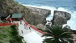 - Udo Shrine (鵜戸神宮, Udo jingū): A shrine built in a cave on a cliff on the coast. According to myth, the main deity of the shrine is the father of the first emperor of Japan, Emperor Jinmu. Visitors pray at the shrine for success in matchmaking and safe childbirth. Below the cliff there is a huge rock shaped like a turtle. It is said that one's wishes will be granted if one can throw a stone into the depression in the center.