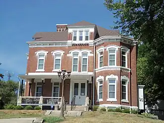 Unlike many German immigrants to Davenport who lived on the west side of town, especially in what is now known as the Hamburg Historic District, Kuhnen built his home on the east side of town. The house was designed by Davenport architect John Ross. It follows the Italianate style, which was popular in the city at the time.[3] Unlike some of the earlier manifestations of the style in Davenport that favored the simplicity derived from the Greek Revival, the Kuhnen House features high Victorian embellishment. It is a two-story structure that is situated on a large corner lot. It features bracketed eaves, a central pavilion that protrudes from the main façade, a porch that covers two-thirds of the front of the building, projecting bays, and triangular roof dormers. Brick and stone are utilized to achieve a polychrome exterior. There is also a variety of window styles employed on the house.