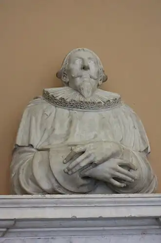 Nicholas Stone was born in 1586, the son of a quarryman of Woodbury, near Exeter.[4] He was first apprenticed to Isaac James, a Dutch-born London mason working in Southwark, London.[4] When the sculptor Hendrik de Keyser (1567–1621), master mason to the City of Amsterdam, visited London in 1606, Stone was introduced to him and contracted to work for him in Holland, where he married de Keyser's daughter and worked with his son Pieter.[4] Stone is thought to have made the portico to the Zuiderkerk in Amsterdam. In 1613 he returned to London with Bernard Janssens, a fellow pupil of de Keyser and settled in Long Acre, St Martin-in-the-Fields, where he established a large practice and workshops and soon became the leading English sculptor of funeral monuments.