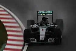 Rosberg continued to drive for Mercedes in 2014 with Lewis Hamilton again as his teammate.[101] He was regarded as a favourite for the WDC because of the team's development of the F1 W05 Hybrid car and adaptation to the technical regulations mandating the use of turbo-hybrid engines in pre-season testing at the Bahrain International Circuit and the Circuit de Barcelona-Catalunya.[82][102] Rosberg won the Australian Grand Prix to take the lead of the WDC and finished second in the next four races but Hamilton's four straight victories lost Rosberg the championship lead. Rosberg won the Monaco Grand Prix for the second year in succession to regain the points lead after qualifying on pole position in contentious circumstances.[101] Victories in Austria, Germany,[28] followed by contact with Hamilton in Belgium made it appear he would win the championship,[28] until a short circuit on his car in Singapore nullified his points lead.[103] Rosberg took four consecutive podium finishes and won the Brazilian Grand Prix to ensure the championship would be decided at the season-ending Abu Dhabi Grand Prix.[101] To win the title, he needed to win the race with Hamilton third or lower.[104] Hamilton was already ahead of Rosberg on track and leading the race when an energy recovery system failure meant Rosberg scored no points for second in the WDC with 317 points.[101]