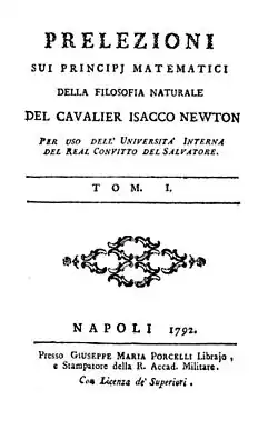 - Prelezioni sui Principi matematici della filosofia naturale del cavaliere Isacco Newton. Napoli. 1792–93. Archived from the original on 1 April 2023.
