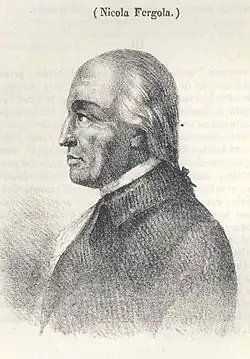 Fergola studied in the Jesuit school; he then went to the university of Naples in 1767, where he studied mathematics under Giuseppe Marzucco.[2] As concerns his philosophical education, he was deeply influenced by the mathematician Nicola Antonio De Martino (1701-1769), and by the Enlightenment philosopher Antonio Genovesi. In particular, Genovesi believed that a science consisted of established, proven, and interconnected truths, and that a scientific theory had to be presented according to the method of the ancient geometers, namely the synthetic method.[3] From Genovesi Fergola inherited his lifelong commitment to synthetic geometry.[4]