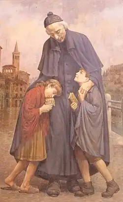He was a student to the priest Antonio Cesari and was also a close disciple to Saint Gaspare Bertoni who both proved to be strong influences on Mazza's life and personal spiritual inclinations. Cesari was brought in to homeschool Mazza since the latter's often frail health prevented him from going to school. His vocation matured under Cesari's guidance and he soon felt called to enter the priesthood as a more direct means to dedicate himself to the needs of the poor.[1] He commenced his ecclesial studies in Verona on 21 June 1807 before Mazza received his ordination to the priesthood on 26 March 1814.[4] Following his ordination he first served in the churches of S. Fermo Maggiore and San Nicolò before being assigned in 1816 to teach seminarians in Verona. For over three decades from 1816 until 1849 he taught students in Verona both mathematics (from 1815 to 1816) and, occasionally, physics and world history.[3] The students held him in high regard as did fellow teachers while some of his students included the Venerable Antonio Provolo and Blessed Zefirino Agostini.[4][2] It was also around this time that he became a confessor and close friend to the Venerable Teresa Campostrini. His professorship solidified his desire to create a range of opportunities for people to have a fairer and better access to education irrespective of their class or economic status. His companions around this point following his ordination - students and confreres alike - knew of Mazza's desire to evangelize Africa and referred to him as "Don Congo".[2]