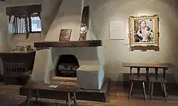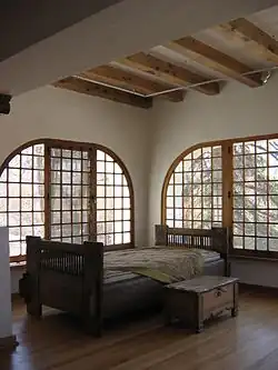 The Nicolai Fechin House in Taos, New Mexico, is the historic home of the Russian artist Nicolai Fechin, his wife Alexandra and daughter Eya. After purchasing the house in 1927, he spent several years enlarging and modifying the two-story adobe structure, for instance, enlarging the porch and adding and widening windows to take advantage of the views. He carved many of the fittings of the house and its furniture, using typical Russian design elements such as "triptych windows and intricately carved doors."[2] The whole reflects a modernist sensibility combined with Russian, Native American, Spanish, and Art Deco traditions.