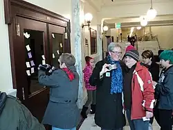 By the end of February, following other protests, 122 arrests had been conducted (with some protestors being arrested for than once, and all of whom are being represented pro bono[44]), and negotiations between LGBT-rights advocates and religiously conservative legislators had tentatively begun.[45] By early March, LeFavour had been arrested four times in five weeks,[46] and in mid-March, was discovered in an act of political theater during a direct action protest after having literally hid in a closet in the Idaho Senate lounge for hours.[47] Ultimately LeFavour has been arrested ten times;[48] at a court hearing in late July 2014 LeFavour took a plea deal and was sentenced to seventy hours of community service and fined $70 plus additional court costs.[49]