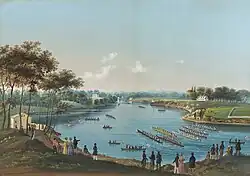 After leaving Spain and making stops in the Canary Islands and Cape Verde, Calyo arrived in the United States in 1834, most likely landing in Baltimore.[4][8] He established a studio there[7] and by 31 August 1834, he completed a commission from Thomas Edmondson; entitled View of Harlem, the painting portrays the Edmondson estate in Baltimore.[9][10] From early to mid-1835, Calyo held multiple successful exhibitions of his paintings of European views in Baltimore.[11] His fourth child, Hannibal, was born in Baltimore in 1835.[12]