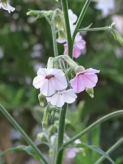 Nicotiana mutabilis, the colour-changing tobacco plant or flowering tobacco plant, is a species of flowering plant in the family Solanaceae.[1] It is native to northeastern Rio Grande do Sul state in Brazil, and it has been introduced to Great Britain.[2] An erect annual or biennial reaching 1.5 m (5 ft), its flowers start out white and fade to pink and finally dark pink.[1] It is available from commercial suppliers.[1]