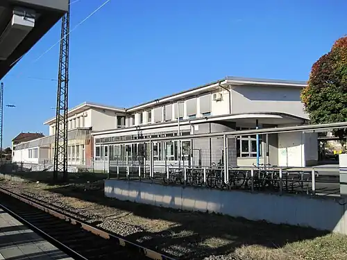 During the introduction of the interim Rhineland-Palatinate integrated regular-interval timetable (Rheinland-Pfalz-Taktes) between early June 2004 and early November 2009, Niederlahnstein station was made a pilot project of Rhineland-Palatinate to convert it into an "environmental station". The core of the concept was the upgrading of the platforms to make them barrier-free. This involved the building of three passenger lifts to the platforms. In addition, new platform canopies, bicycle parking, short-term parking and a new pedestrian underpass as an entry to the station were built. The municipality of Lahnstein was commissioned to carry out the redevelopment of the station forecourt. The total construction cost of the project was €5.4 million.[4]