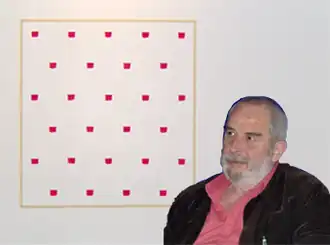 In 1966 Toroni started a practice he calls "Travail-Peinture".[2] Toroni's method, brushstrokes made with imprints of a no. 50 paintbrush repeated at perpendicular 30 centimeter intervals,[3] was first shown at a debut in 1967 in Paris at an exhibition-performance at the Salon de la Jeune Peinture in the Musèe d'Art Moderne de la Ville de Paris.[4] That same year, Toroni founded the BMPT (art group) together with Daniel Buren, Olivier Mosset, and Michel Parmentier.[5] In works like Miroir d’Eau (1973) and Vert Wagon (1977), the imprints made with a n°50 paintbrush are repeated at regular intervals of 30 cm.[6]