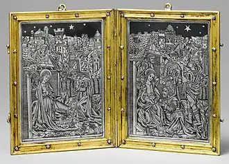 Niello /niːˈɛloʊ/[1][2] is a black mixture, usually of sulphur, copper, silver, and lead,[3] used as an inlay on engraved or etched metal, especially silver. It is added as a powder or paste, then fired until it melts or at least softens, and flows or is pushed into engraved lines in the metal. It hardens and blackens when cool, and the niello on the flat surface is polished off to show the filled lines in black, contrasting with the polished metal around it.[4] It may also be used with other metalworking techniques to cover larger areas, as seen in the sky in the diptych illustrated here. The metal where niello is to be placed is often roughened to provide a key. In many cases, especially in objects that have been buried underground, where the niello is now lost, the roughened surface indicates that it was once there.