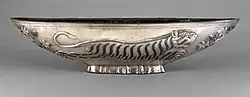 Niello is then hardly found until the Roman period; or perhaps it first appears around this point.[21] Pliny the Elder (AD 23–79) describes the technique as Egyptian, and remarks the oddness of decorating silver in this way.[22] Some of the earliest uses, from 1–300 AD, seem to be small statuettes and brooches of big cats, where niello is used for the stripes of tigers and the spots on panthers; these were very common in Roman art, as creatures of Bacchus. The animal repertoire of Roman Britain was somewhat different, and provides brooches with niello stripes on a hare and a cat.[23] From about the 4th century, it was used for ornamental details such as borders and for inscriptions in late Roman silver, such as a dish and bowl in the Mildenhall Treasure and pieces in the Hoxne Hoard, including Christian church plate. It was often used on spoons, which were often inscribed with the owner's name, or later crosses. This type of use continued in Byzantine metalwork, from where it passed to Russia.