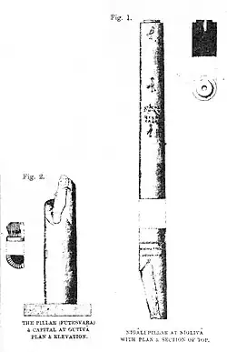 Besides his description of the pillar, Führer made a detailed description of the remains of a monumental "Konagamana stupa" near the Nigali Sagar pillar,[7] which was later discovered to be an imaginative construct.[8] Führer wrote that "On all sides around this interesting monument are ruined monasteries, fallen columns, and broken sculptures", when actually nothing can be found around the pillar.[9] In the following years, inspections of the site showed that there were no such archaeological remains, and that, in respect to Fuhrer's description "every word of it is false".[10] It was finally understood in 1901 that Führer had copied almost word-for-word this description from a report by Alexander Cunningham about the stupas in Sanchi.[11]