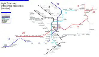 - ^ "Night Tube Map". Transport for London. 2014. Archived from the original on 9 December 2014. Retrieved 22 August 2017.