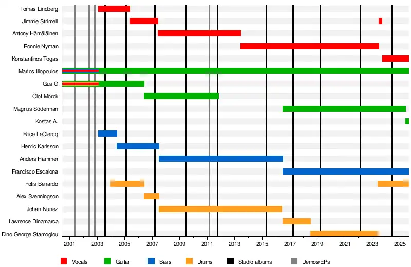 When Gus G was performing with Arch Enemy at Ozzfest 2005, he was replaced by Pierre Lysell for Nightrage's touring activities. For some of Nightrage's tour in support of Bolt Thrower, Gus G was again unavailable and his place was taken by Christian Muenzer, of Necrophagist. In March 2006, Gus G. permanently left Nightrage to focus completely on Firewind (later in 2009 becoming the guitarist for Ozzy Osbourne). At this time, Fotis Benardo decided also to leave Nightrage and focus on the reunited Septic Flesh. He was replaced by Alex Svenningson.