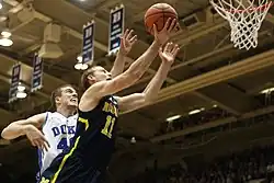 In the offseason, Stauskas added 16 pounds (7.3 kg) to his frame and 6 inches (15.2 cm) to his vertical jump.[58] On November 12, Stauskas posted career highs of 23 points and 5 assists in the second game of the regular season against South Carolina State.[59][60] In the next game, Stauskas contributed a career-high 6 assists as well as 20 points against Iowa State on November 17.[61] Stauskas scored a game-high 24 points on November 21 against Long Beach State in the first round of the Puerto Rico Tip-Off, surpassing his career high[62] set two games before and giving him three consecutive 20-point performances for the first time in his career.[63][64] Stauskas established another career high the next day against Florida State as he scored 26 points including 7 of the team's 13 points in overtime, despite scoring only 3 points in the first half. In the game, he set a career high with 9 made free throws and logged his fourth consecutive 20 point game. Following a Michigan timeout with 11 seconds in regulation, Stauskas made a layup to force overtime.[65][66][67] In the championship game against Charlotte, Stauskas tallied 20 points and a career-high 3 steals.[68] Although Michigan lost in the championship game, Stauskas earned tournament MVP honors.[69] In the second half Stauskas twisted his ankle, but continued to play the final 9½ minutes.[70] Stauskas sat out the November 29 game against Coppin State to rest his ankle.[71][72]