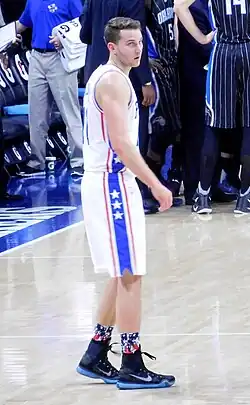 On July 10, 2015, Stauskas was traded to the Philadelphia 76ers along with Carl Landry, Jason Thompson, a future first round pick, and the rights to swap first round picks in 2016 and 2017, in exchange for the rights to Artūras Gudaitis and Luka Mitrović.[160] During the preseason, Stauskas was impaired by a right tibia stress reaction.[161] Although he felt recovered from the stress reaction by the beginning of the season, he missed the October 28 season opener with back spasms.[162] Stauskas debuted for the 76ers on October 30 against the Utah Jazz, scoring 12 points.[163] Stauskas moved into the starting lineup on November 2 against the Cleveland Cavaliers.[164][165] He posted a career-high-tying 15 points.[166][167] On November 7, Stauskas posted a career-high 18 points and career-high tying five assists against the Orlando Magic.[168]