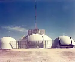 Since MAR was central to the entire Nike-X system, it had to survive attacks directed at the radar itself. At the time, the response of hardened buildings to nuclear shock was not well understood, and the MAR-I building was extremely strong. It consisted of a large central hemispherical dome of 10 foot (3.0 m) thick reinforced concrete[95] with similar but smaller domes arranged on the corners of a square bounding the central dome. The central dome held the receiver arrays, and the smaller domes the transmitters. The concept was designed to allow a transmitter and receiver to be built into any of the faces to provide wide coverage around the radar site.[96] As a test site, MAR-I only installed the equipment on the northwest facing side, although provisions were made for a second set on the northeast side that was never used. A tall clutter fence surrounded the building, preventing reflections from nearby mountains.[93]