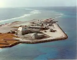 Construction of the launch site on Meck began in late 1967. In this installation, the majority of the system was built above ground in a single-floor rectangular building. The MSR was built in a boxy extension on the northwestern corner of the roof, with two sides angled back to form a half-pyramid shape where the antennas were mounted. Small clutter fences were built to the north and northwest, and the western side faced out over the water which was only a few tens of meters from the building.[113] Illeginni did not have a radar site; it was operated remotely from Meck.[114]