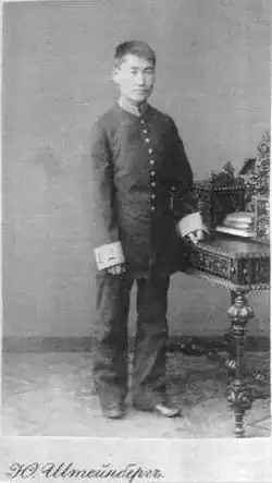 Katanov was influenced by I. I. Karatanov, an employee of Kuznetsov, who had a small collection of books on the peoples of Siberia and became his first teacher. Karatanov instilled in Nikolai a deep interest in the culture and history of Turkic peoples.[15][16][17] After the death of his father in 1874, Nikolai worked as a shepherd in the summer and came under the care of his uncle, who arranged for him to be a clerk in the Askizsk steppe duma. During his two years of service, Katanov learned Russian literacy and calligraphy. In 1876, Nikolai decided to continue his education and enrolled in the Krasnoyarsk Gymnasium with the help of P.I. Kuznetsov, who was the mayor of Krasnoyarsk at the time. He secured a recommendation from I.I. Karatanov and travelled to the city by boat along the Abakan and Yenisey.[18]