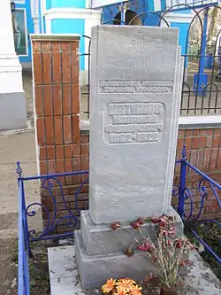 The death certificate indicates that the scientist was buried in the fence of the Spaso-Preobrazhensky Monastery within the Kazan Kremlin. In 1928, the executive committee of the city permitted the remains to be transferred to the Arskoe cemetery, where they were interred near the grave of N.I. Ilminsky, one of N.F. Katanov's first teachers.[104] There is, however, a version that in the Arskoe cemetery, there is only a cenotaph built for the 110th anniversary of the scientist in 1972, and the actual location of his burial has been lost for some time.[55][106] In 2023, A. S. Nilogov published an official record on the death of N. F. Katanov (No. 335 of 9 March 1922), which is kept in the State Archive of the Republic of Tatarstan. The record confirms that Professor Katanov died on 9 March and was buried in the Arskoe cemetery. A. S. Nilogov suggests that to determine if the current tombstone is a cenotaph, exhumation, forensic medical examination, and genetic analysis of the direct male line of the Katanov family are necessary.[107]