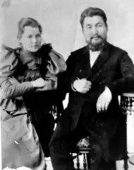 On 14 October 1892, N.F. Katanov married Alexandra Ivanovna Tikhonova (1875–1942) at the Peter and Paul Church in Askiz. Alexandra was the adopted daughter of his uncle, Efim Semyonovich. Although the church books in Askiz have not been preserved, a written act called a 'marriage search' was conducted to establish the absence of obstacles to the marriage, such as closely related marriages. This document includes metric and biographical information about the bridegroom. Marriage searches are usually less well-preserved than other such documents.[40] The wedding was attended by a large number of guests, including Innokenty and Ivan, the two sons of goldsmith Pyotr Ivanovich Kuznetsov, who were friends and supporters of the young Katanov. Also in attendance was N.M. Martyanov, the director of the Minusinsk Museum. Alexandra Ivanovna, who graduated from the Minusinsk gymnasium and had a talent for music, played the piano. For 30 years, she assisted her husband with translations and extracts. The couple had a daughter named Anna (1901–1980), who later became a teacher. Katanov also raised his sister Maria's son, Nikolai Gavrilovich Tyunesteev, and gave him his surname. Nikolai Katanov was arrested and executed in 1938.[41][42]