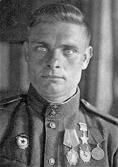 Deployed to the front of World War II in July 1941, he quickly rose up through command positions, starting off as a platoon commander and then seeing promotion to command a company, and later commanded a battalion. Having fought in the battle of Kursk, he went on to distinguish himself in the Dniepr crossing, where on 23 September 1943 he led his company to be the first in their regiment to cross to the Western bank of the river. There, they maintained a bridgehead on the riverbank near the village of Grigorovka, and held their ground under heavy enemy fire until reinforcements arrived. For his actions in that battle he was awarded his first gold star on 10 January 1944. Later on in the war on 23 January 1945 he led his battalion in the crossing of the Oder River; there, he quickly diverted his battalion to the side after unexpectedly encountering enemy forces, allowing them to go on to complete their task of taking a key bridgehead and helping tanks cross. For his actions in the crossing he was awarded his second gold star on 10 April 1945, making him a double Hero of the Soviet Union. Throughout the course of the war he fought on the Southwest, Bryansk, Central, Voronezh, and 1st Ukrainian fronts.