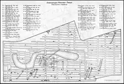 The cemetery was opened in 1863, to the east of the Cathedral of the Holy Trinity, the main church of the monastery.[1] It was the third cemetery in the complex, after the original Lazarevskoe Cemetery in the 1710s, and the Tikhvin Cemetery in 1823.[1] It was constructed on a space originally planned for a garden at the main entrance to the monastery, but that instead had become used for roads and palisades.[2] It was first called the Zasobornoye Cemetery (Russian: Засоборное), but became known as the Nikolskoe after the construction of the Church of St. Nicholas between 1868 and 1871 to the design of diocesan architect Grigory Karpov.[1][2] The church was funded by the wealthy merchant N. I. Rusanov, who established his family tomb on the ground floor.[3] The Spiritual Council noted that "the Lavra cemetery is not open to everyone, as are the city cemeteries, but only a few persons from the government service and persons with honorary titles are buried here."[2] Part of the cemetery also served as the burial site for the Monastery's monks and the metropolitans of Saint Petersburg, leading to the name Bratskoe (Russian: Братское), or "Brotherhood" section.[4]