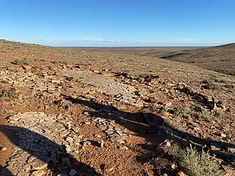 Another theory suggests that the term may be a mispronunciation of the two words "Yata Takarra", meaning hard or stony ground ("in reference to the flat Ediacara plateau of dolomite that forms the centre of the Ediacara syncline").[8] Supporting this latter contention, it has been argued that the word "has nothing in it that corresponds to any word for water in any of the local languages" and that local tradition "has it that the name meant 'granite plain', but, since there appears to be no igneous rock in the area, this could well refer to the hardness of the ground, rather than to its geological composition".[4]