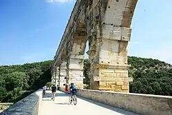 The Pont du Gard is an ancient Roman aqueduct bridge built in the first century AD to carry water over 50 km (31 mi) to the Roman colony of Nemausus (Nîmes).[3] It crosses the river Gardon near the town of Vers-Pont-du-Gard in southern France. The Pont du Gard is one of the best preserved Roman aqueduct bridges. It was added to UNESCO's list of World Heritage sites in 1985 because of its exceptional preservation, historical importance, and architectural ingenuity.[4]