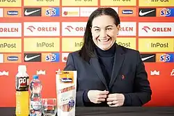 In March 2021, she replaced Miłosz Stępiński as the head coach of the senior women's national team,[1] becoming the first female coach in history to hold this position.[1] She made her debut in a friendly match against Sweden on 13 April 2021.[8]