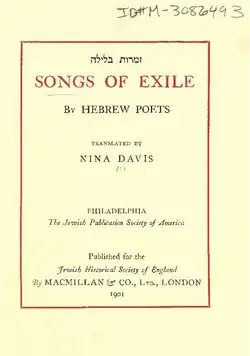 Nina's first published translation, of Abraham ibn Ezra's The Song of Chess, appeared in the Jewish Chronicle on 22 June 1894.[4] Later that year, she contributed an essay and a poem on "The Ideal Minister of the Talmud" to the Jewish Quarterly Review, then under the editorship of Claude Montefiore and Israel Abrahams, and continued thereafter publishing translations of medieval Hebrew poetry in the Jewish press.[12] Israel Zangwill, an acquaintance of her father, provided her with an introduction to Mayer Sulzberger of the Jewish Publication Society of America, which published her Songs of Exile by Hebrew Poets in 1901.[9] The collection, which attracted widespread attention, included translations of poems by Judah Halevi, Abraham ibn Ezra, Eleazar ben Killir, Solomon ibn Gabirol, Joseph ben Samuel Bonfils, and Meir of Rothenburg, as well as passages from the Talmud and Midrash Rabba.[13]