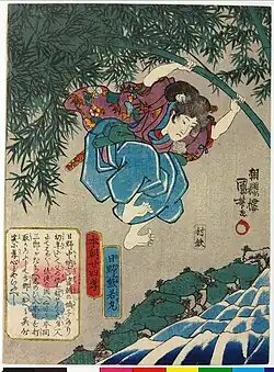 The title ninja has sometimes been attributed retrospectively to the semi-legendary 2nd-century prince Yamato Takeru.[19] In the Kojiki, the young Yamato Takeru disguised himself as a charming maiden and assassinated two chiefs of the Kumaso people.[20] However, these records take place at a very early stage of Japanese history, and they are unlikely to be connected to the shinobi of later accounts. The first recorded use of espionage was under the employment of Prince Shōtoku in the 6th century.[21] Such tactics were considered unsavory even in early times, when, according to the 10th-century Shōmonki, the boy spy Hasetsukabe no Koharumaru was killed for spying against the insurgent Taira no Masakado.[22] Later, the 14th-century war chronicle Taiheiki contained many references to shinobi[19] and credited the destruction of a castle by fire to an unnamed but "highly skilled shinobi".
