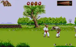 The protagonist has a carrot as a life bar. As he takes damage, his carrot bar gets eaten. When his health bar is empty, he falls to the grounds and loses a life. He starts the game with 3 lives. He can go only to the right but sometimes down into sewers. He can use either his hands, feet, or stick to attack. Enemies include flying dragons, street thugs, other ninja, bears, frogs, and other anthropomorphic animals, one of the enemies resembles Raphael from Teenage Mutant Ninja Turtles, in the second level of the game, one of the enemies resembles Splinter.