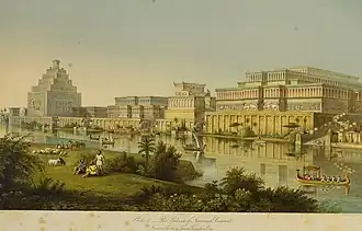 In the 1840s, the British archaeologist Austen Henry Layard uncovered numerous stone carvings of winged, eagle-headed genii at Kalhu.[4][6] Remembering the Biblical story of Sennacherib's murder, Layard mistakenly identified these figures as "Nisrochs".[4][6] Such carvings continued to be known as "Nisrochs" in popular literature throughout the remaining portion of the nineteenth century.[4][6] In Edith Nesbit's classic 1906 children's novel The Story of the Amulet, the child protagonists summon an eagle-headed "Nisroch" to guide them.[4] Nisroch opens a portal and advises them, "Walk forward without fear" and asks, "Is there aught else that the Servant of the great Name can do for those who speak that name?"[4] Some modern works on art history still repeat the old misidentification,[6] but Near Eastern scholars now generally refer to the "Nisroch" figure as a "griffin-demon".[6]