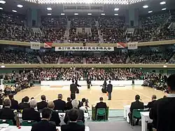 On 31 January 1962, with the approval of the Minister of Education, the Nippon Budokan Foundation (Chairman: Matsutaro Shoriki; Vice-chairmen: Atsutaro Kimura, Shigeyoshi Matsumae; Chairman of the Board: Munenori Akagi) was established.[6] After much deliberation, the site for the building was finally decided upon in Kitanomaru, and the Nippon Budokan was completed on 15 September 1964.[7] The opening ceremony was held on October 3, in the presence of Emperor Showa and Empress Kojun. On 15 October, the Tokyo Olympic martial arts exhibition competitions (kendo, kyudo, and sumo) were held, and from 20 to 23 October, the Olympic judo competitions. Since then, in line with its founding purpose, the Nippon Budokan has been used to promote and popularize various martial arts, hosting various martial arts tournaments, and also for various national events with a public mission.