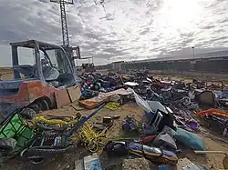 After the Israeli disengagement from the Gaza Strip, Nir Oz again became a "border settlement"[8] and frequently received rocket and sniper fire from Gaza.[7][12] In 2008 the Israel Defense Forces (IDF) asked the kibbutz to harvest its potatoes at night to lower the risk of attack.[13][7] On 5 June 2008 a mortar bomb fired from the Gaza Strip hit the Nirlat paint factory on the kibbutz, killing an employee and wounding four others. Hamas claimed responsibility for the attack.[14][15] In 2013, a tunnel from Gaza was found near Nir Oz.[16][17][7] James Fergusson reported in a 2023 book that the village had a number of "self-contained bomb shelters, each weighing 67 tons".[6]