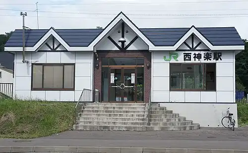 Nishi-Kagura Station (西神楽駅, Nishi-Kagura-eki) is a train station located in Asahikawa, Hokkaidō, Japan. It is operated by the Hokkaido Railway Company. Only local trains stop. The station is assigned the station number F33.